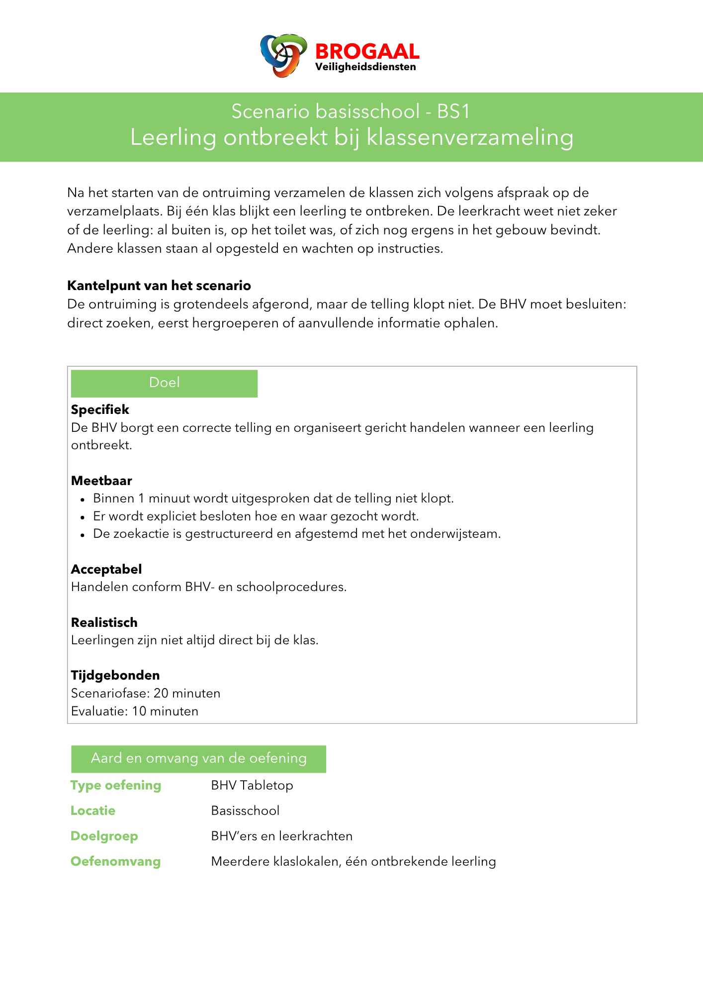 Kies een scenario dat aansluit bij jouw lesdoel, zoals een ontruiming, EHBO-situatie of brandmelding op school. Of laat deelnemers een kaart trekken voor een verrassend effect.