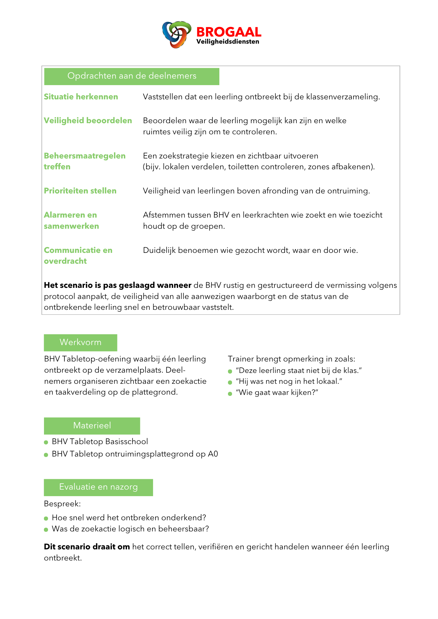 Gebruik de BHV tabletop Basisschool om het visueel en interactief te maken. Voeg eventueel een Tabletop Ontruimingsplattegrond Basisschool toe om vluchtroutes, werkplekken en risicozones duidelijk in beeld te brengen. Binnenkort is de BHV tabletop Middelbare school leverbaar.