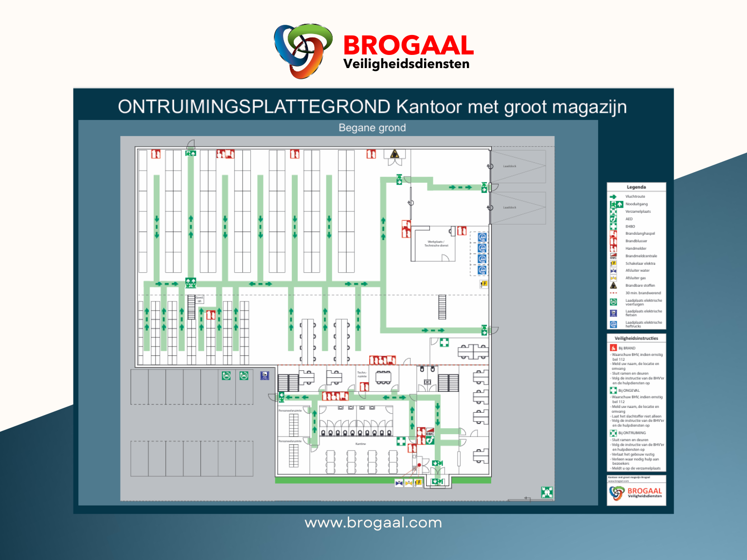 Aan de hand van een herkenbare plattegrond van het kantoor en het magazijn oefenen medewerkers samen wat te doen bij brand, een ontruiming of een andere noodsituatie.